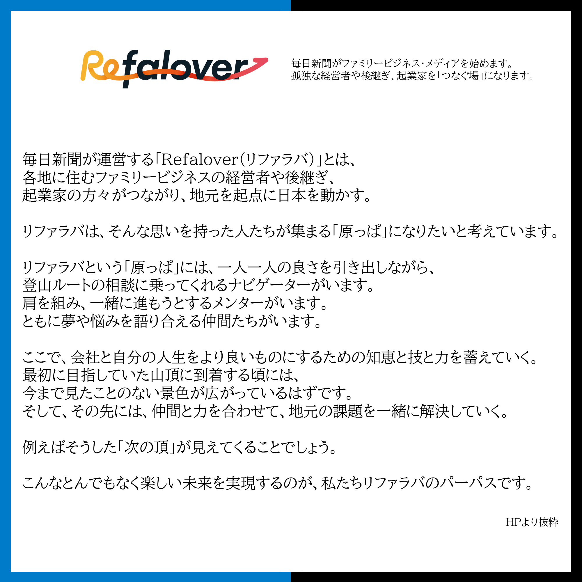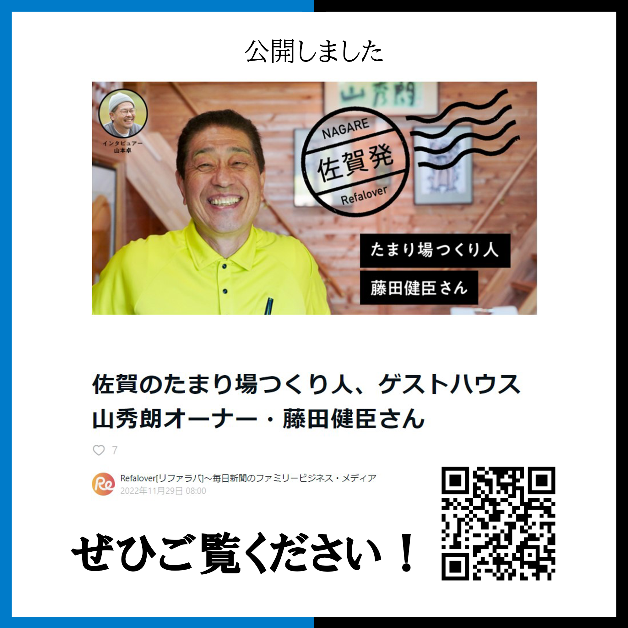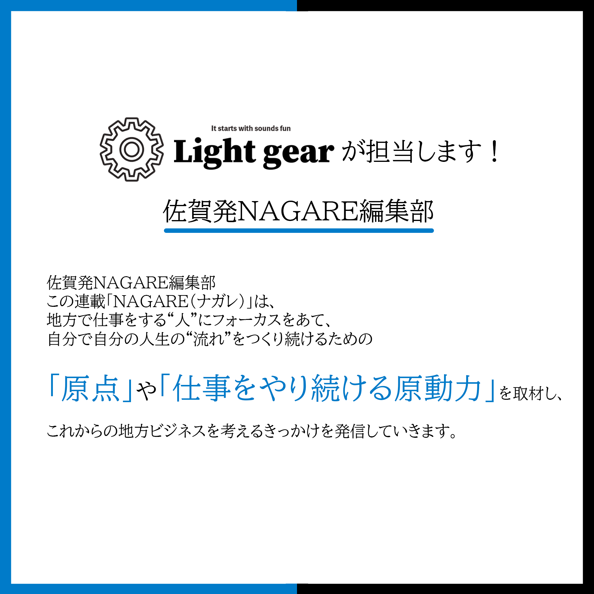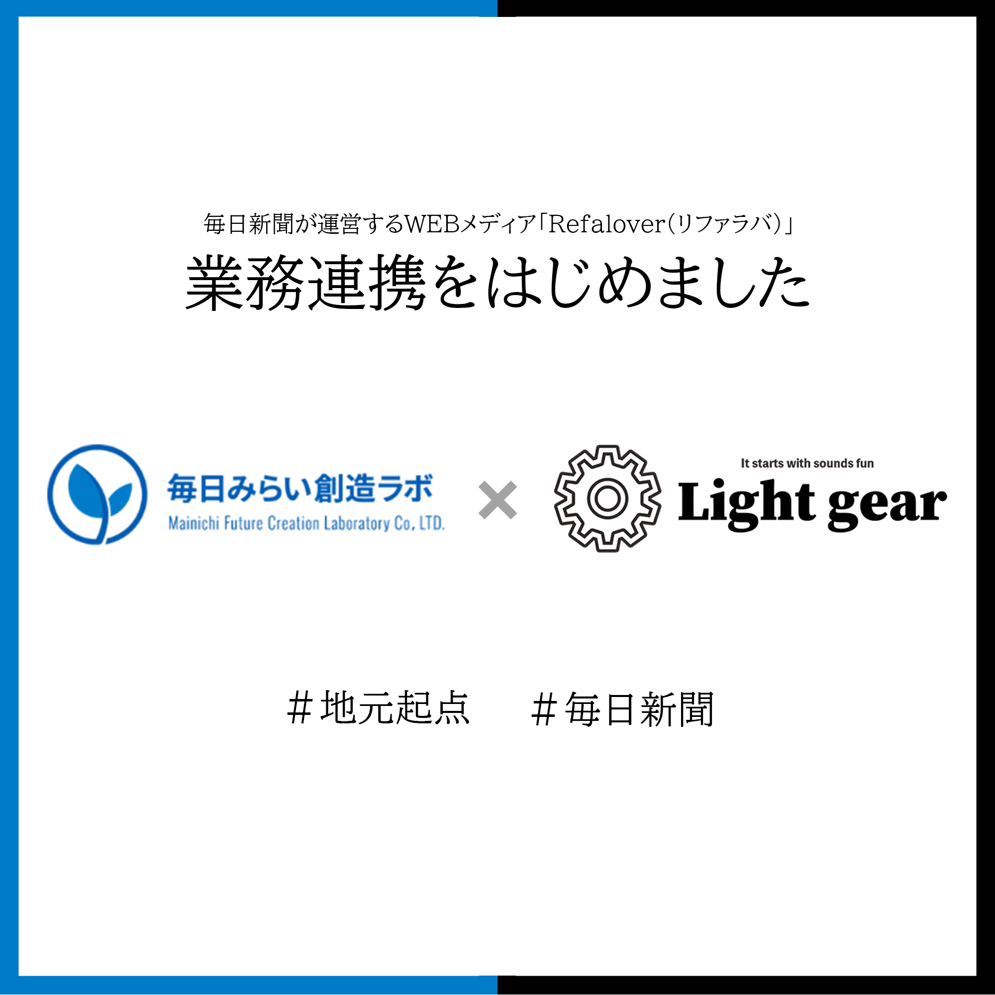 地方で頑張るビジネスを応援するWEBメディア「Refalover] 毎日新聞社と業務連携を開始 2022.11.30 合同会社Light gear(本社:佐賀県佐賀市富士町、代表CEO:山本卓は、毎日新聞社の毎日みらい創造ラボと業務連携をすることになりました。 毎日新聞が運営する「Refalover(リファラバ)」とは、 各地に住むファミリービジネスの経営者や後継ぎ、 起業家の方々がつながり、地元を起点に日本を動かす。 リファラバは、そんな思いを持った人たちが集まる「原っぱ」になりたいと考えています。 リファラバという「原っぱ」には、一人一人の良さを引き出しながら、 登山ルートの相談に乗ってくれるナビゲーターがいます。 肩を組み、一緒に進もうとするメンターがいます。 ともに夢や悩みを語り合える仲間たちがいます。 ここで、会社と自分の人生をより良いものにするための知恵と技と力を蓄えていく。 最初に目指していた山頂に到着する頃には、 今まで見たことのない景色が広がっているはずです。 そして、その先には、仲間と力を合わせて、地元の課題を一緒に解決していく。 例えばそうした「次の頂」が見えてくることでしょう。 こんなとんでもなく楽しい未来を実現するのが、 私たちリファラバのパーパスです。 「Refalover(https://refalover-note.mainichi.jp/)」の1つのコンテンツ「NAGARE編集部」を担当。 ■若手のライター育成にも力を入れていきます。 最新記事公開中!! https://refalover-note.mainichi.jp/n/n48cb42841ca6 < 佐賀県地球温暖化防止活動推進センター様の動画制作を担当させていただきました。わくわく生み出す 山の中の隠れ家的コラボスペース「音無てらす」オープン! >